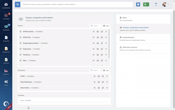Assigning locations, groups, and companies correctly ensures the service desk can route requests, apply SLAs, and manage permissions in a way that matches the organization’s multi-site structure.
