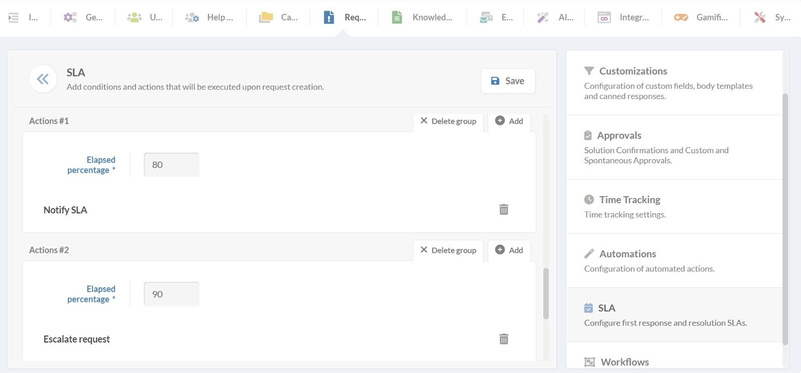 Para fazer isso, você anexará ações que serão executadas automaticamente quando uma determinada porcentagem do SLA tiver passado ou quando ele expirar.