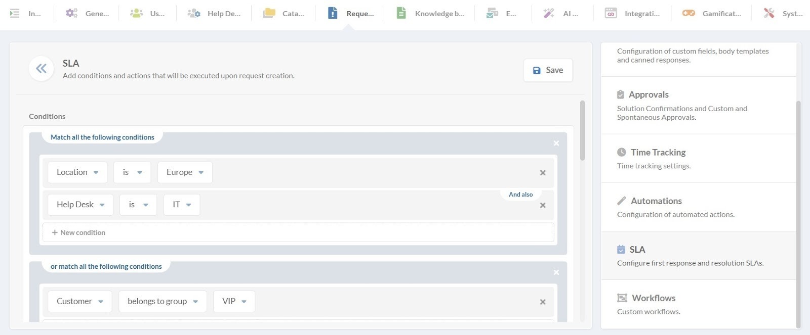 Isso garantirá que o contrato seja aplicado aos tickets corretos, para que você possa confiar nas informações que eles coletam. Você pode combiná-los usando grupos de condições para ajustar a política. Por exemplo, um SLA pode se aplicar a solicitações tratadas pelo help desk do suporte de TI e classificadas como de alta prioridade, mas somente para um local específico.