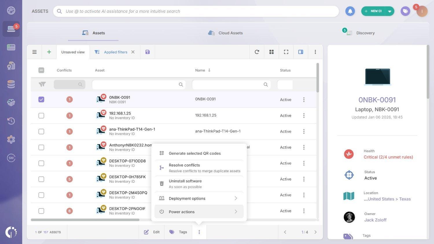 - Monitore ativos com conflitos — Crie uma rotina para rastrear e resolver novos conflitos à medida que surgirem. Você pode encontrá-los no Explorador de Ativos usando filtros ou usar a barra de pesquisa de IA com consultas em linguagem natural, como "ativos com conflitos". Você também pode salvar uma visualização focada em conflitos para monitoramento contínuo, configurar alertas para ser notificado quando conflitos aparecerem ou criar um painel com gráficos que se atualizam automaticamente para acompanhar a qualidade do inventário.